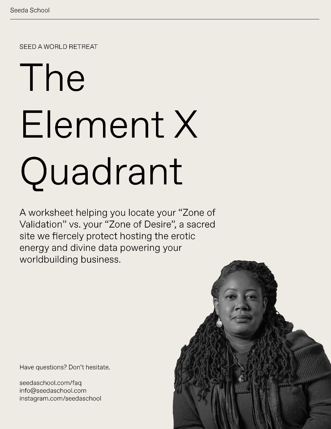 Inside Seeda School we use The Element X Quadrant to locate the shape of your Zone of Validation vs. Zone of Desire. It is from inside your Zone of Desire that we will imagine and design your income generating creative offer.